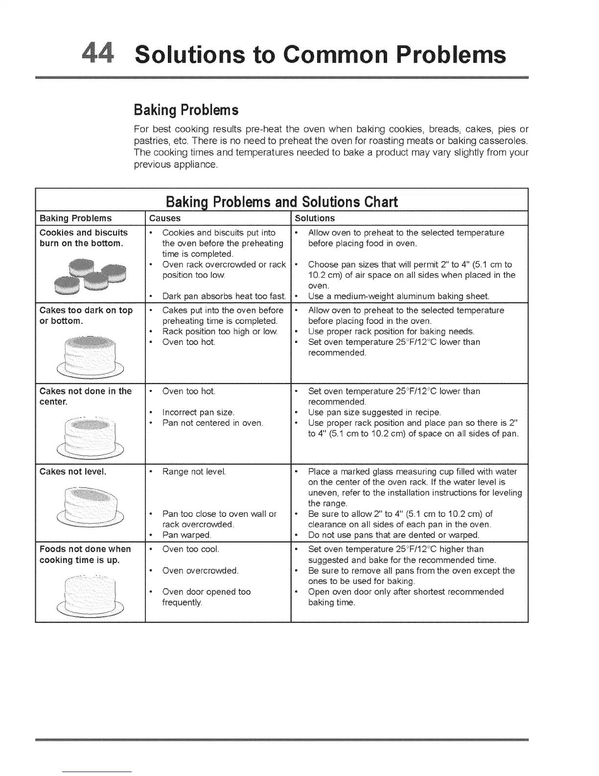 Cakes not done in the - Oven too hot. • Set oven temperature 25°F/12°C lower than
