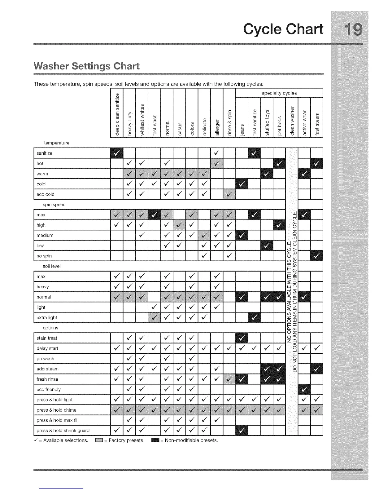 These temperature, spin speeds, soil levels and options are available with the following cycles: