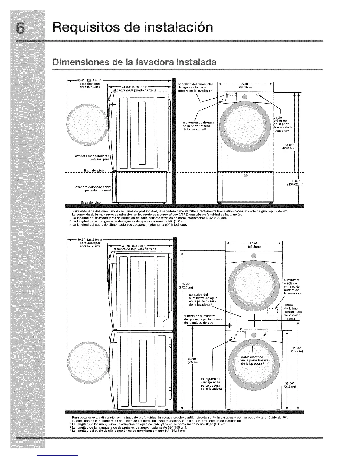 * Para obtener estas dimensiones rnJnimas de profundidad, la secadora debe ventilar directamente hacia arras o con [in code de giro r_pido de 90 °.
