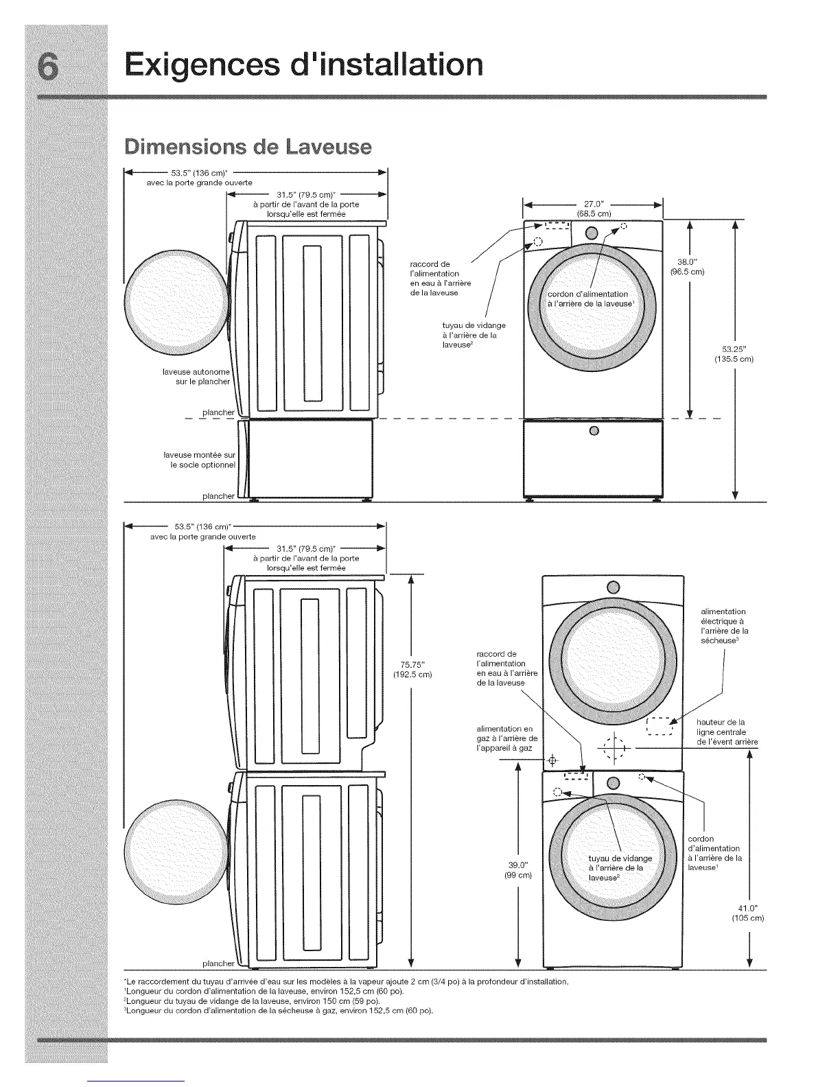 3Longueur du cordon d'alimentation de la s6cheuse & gaz, environ 152,5 cm (60 po).