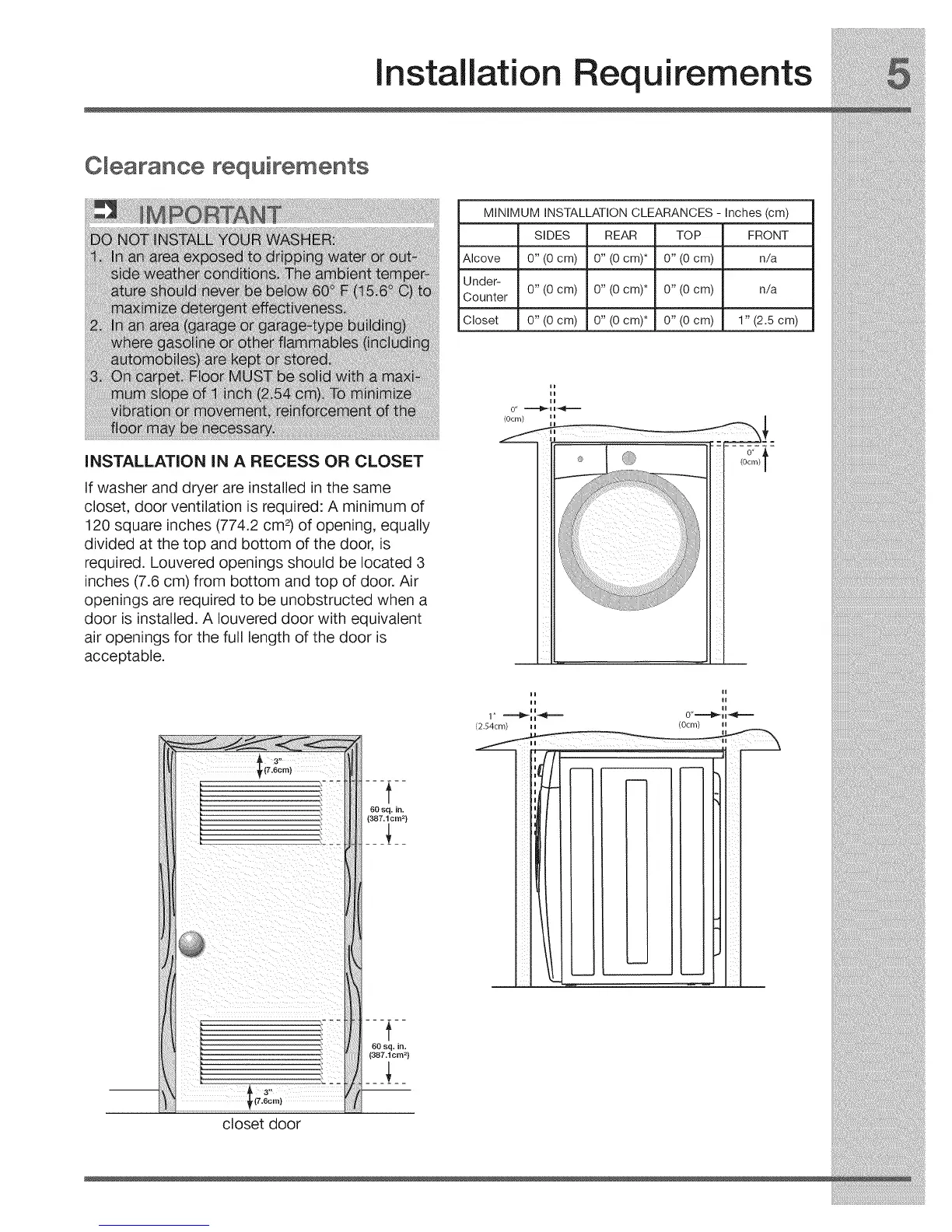 Closet 0" (0 cm) 0" (0 cm)* 0" (0 cm) 1" (2.5 cm)