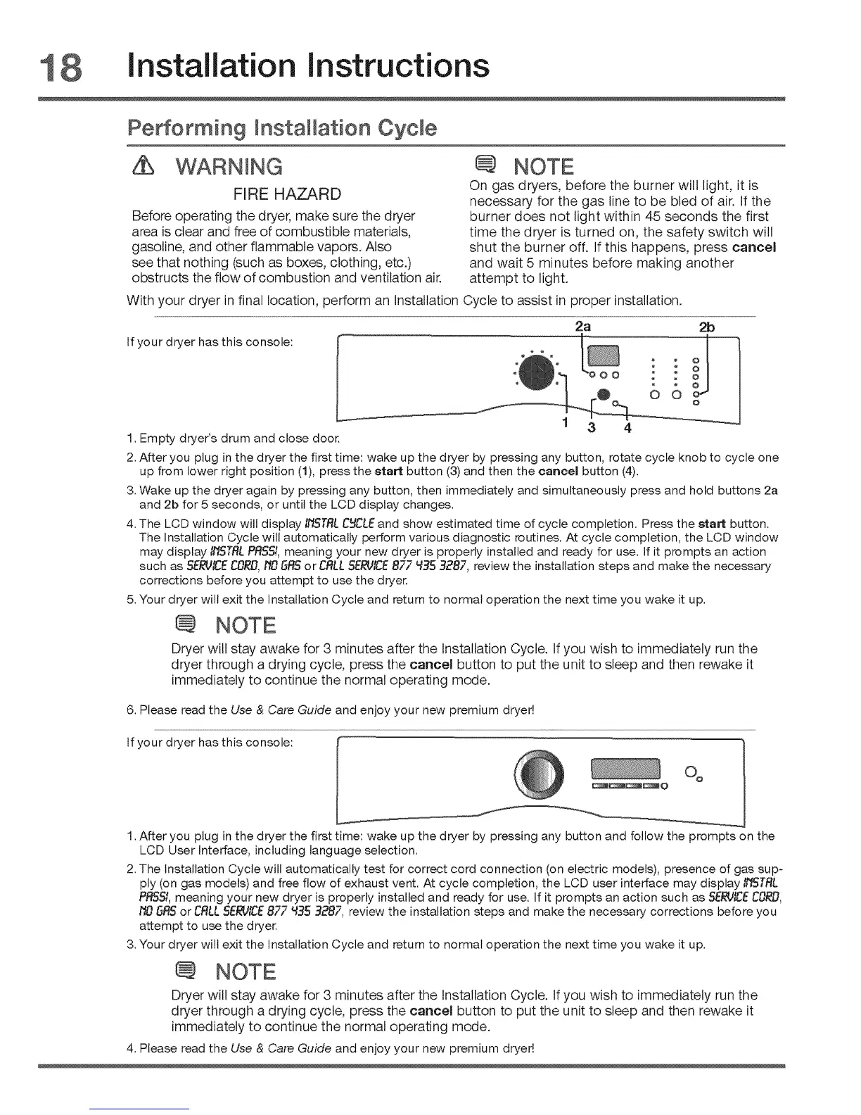 ply (on gas models) and free flow of exhaust vent. At cycle completion, the LCD user interface may display INSTRL