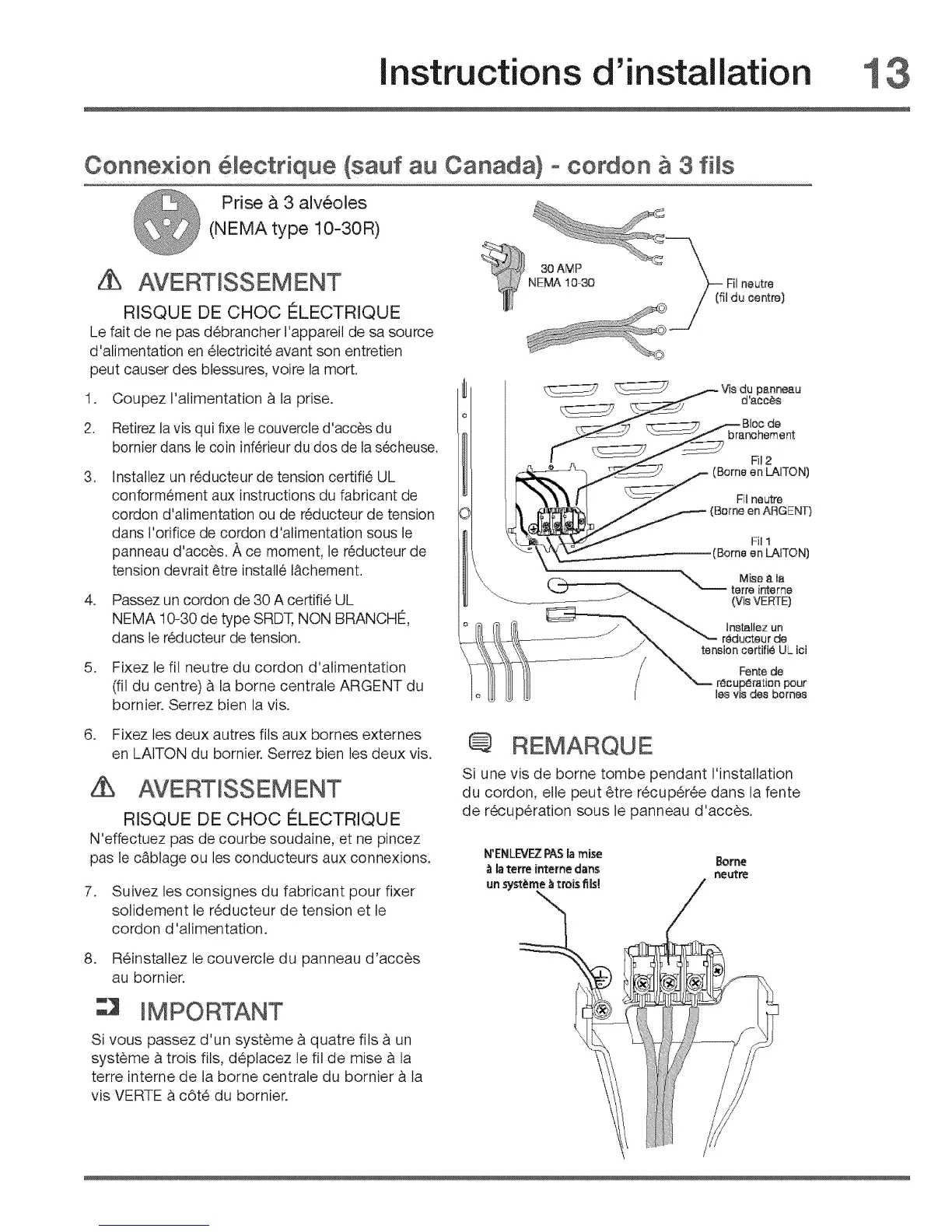 Connexion _lectrique (sauf au Canada) ocordon _ 3 fils