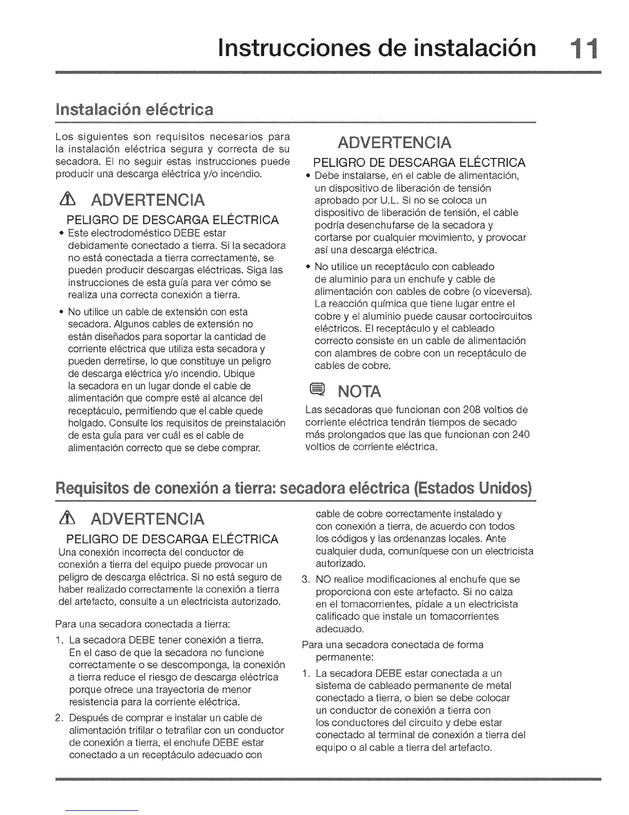 Requisitos de conexi6n a tierra: secadora e[ ctrica (Estados Unidos}