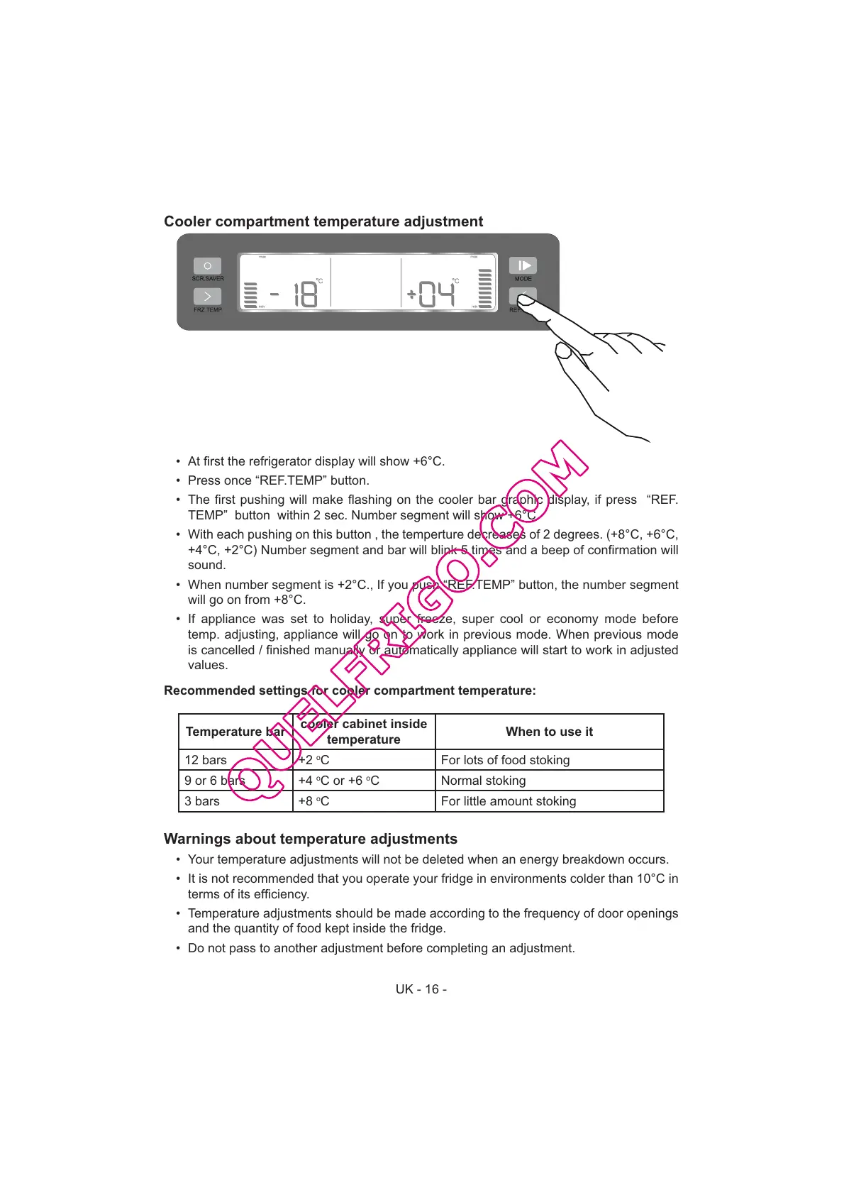 temp. adjusting, appliance will go on to work in previous mode. When previous mode