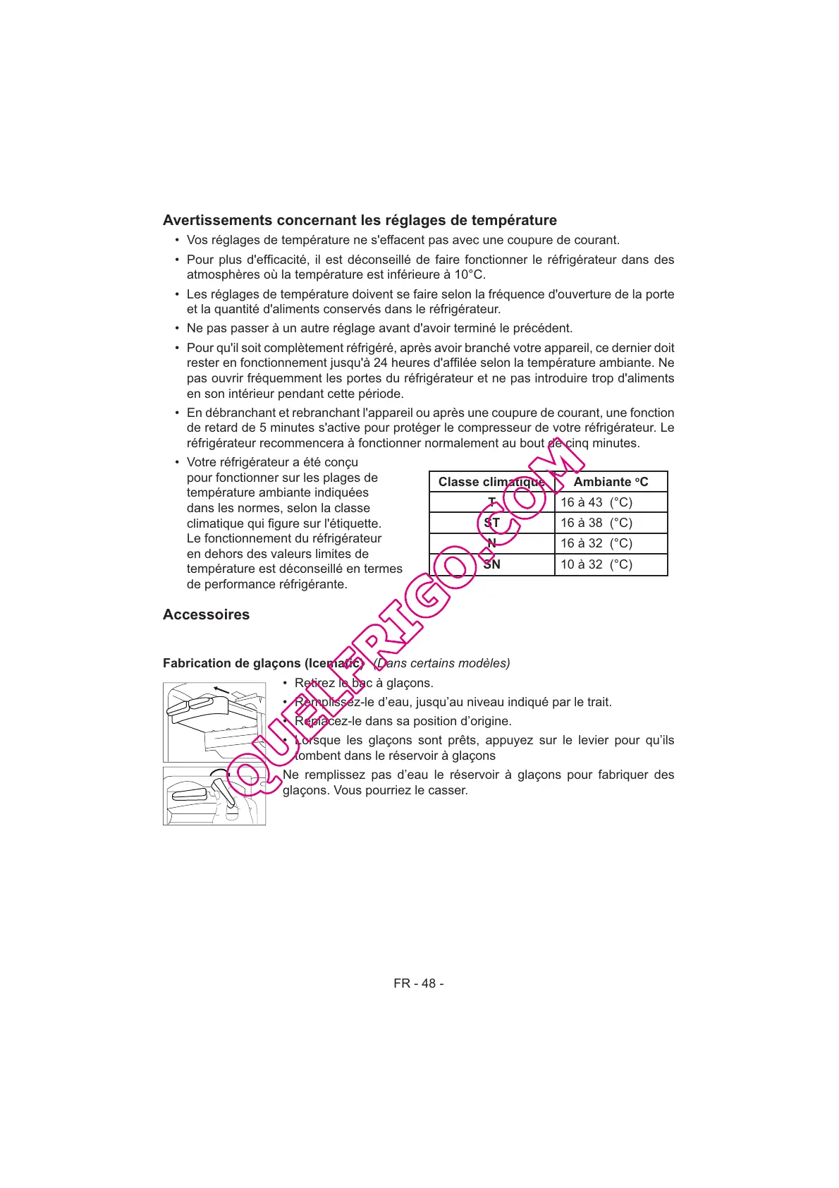 Ne remplissez pas d’eau le réservoir à glaçons pour fabriquer des