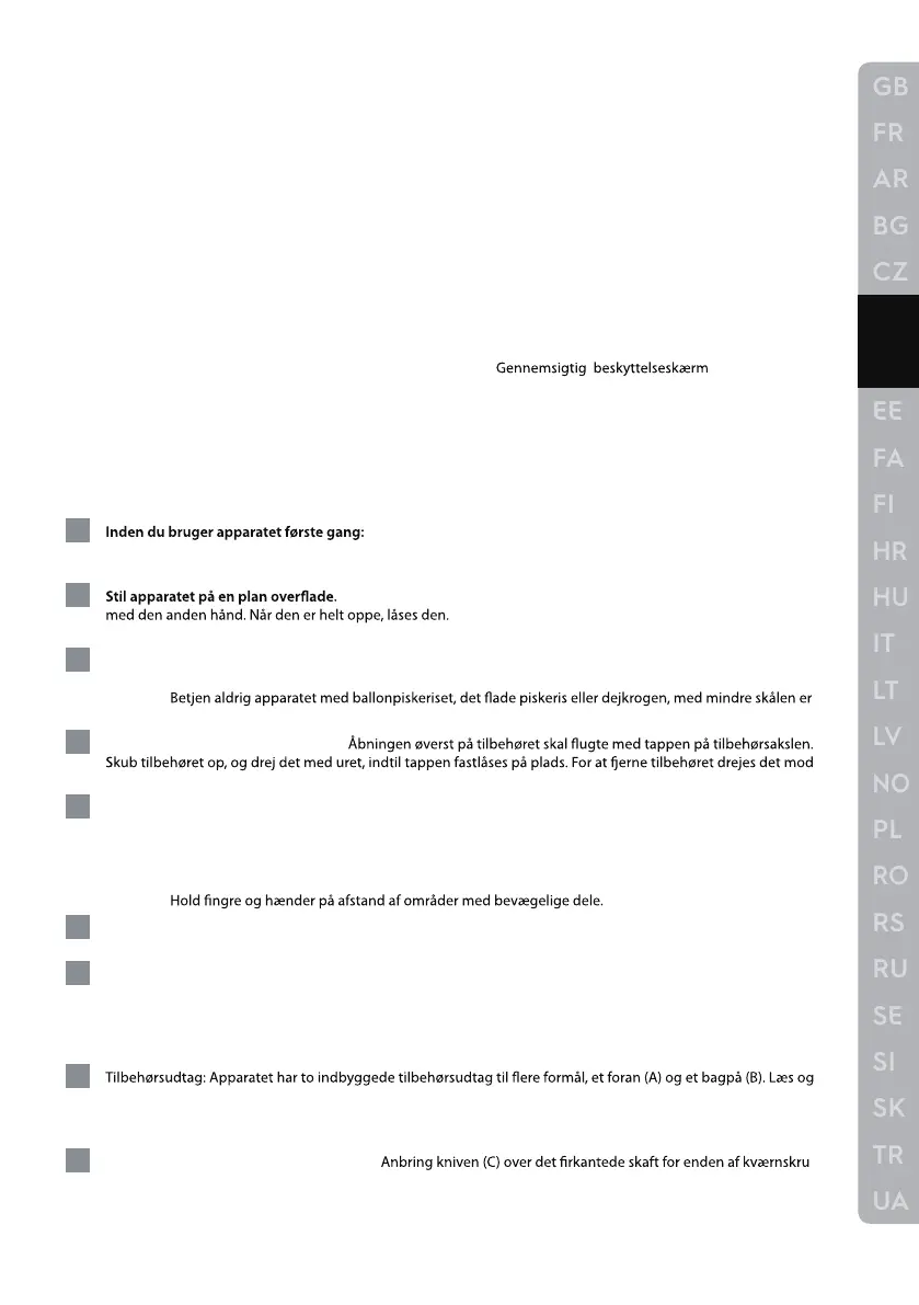 oven på skålen ved at lade tilbehøret stikke gennem åbningen i beskyttelsesskærmen Drej beskyttelsesskærmen