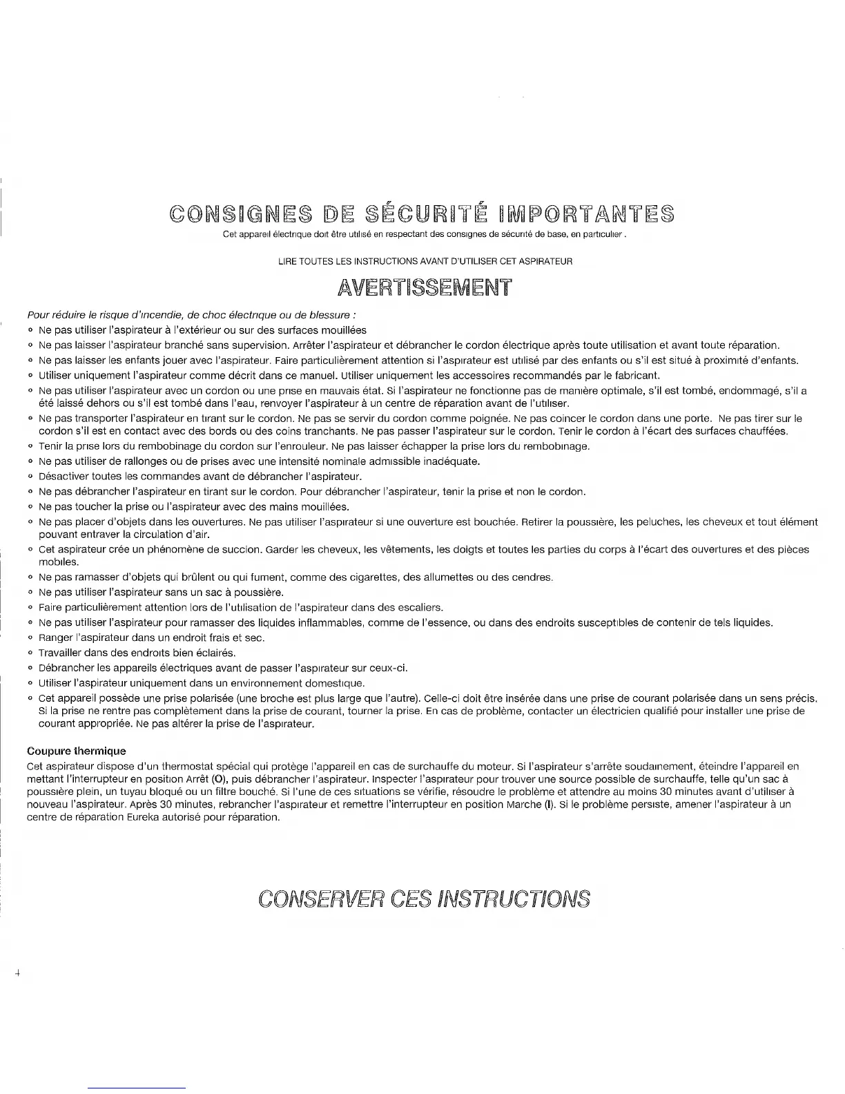 LIRE TOUTES LES INSTRUCTIONS AVANT D'UTILISER CET ASPIRATEUR