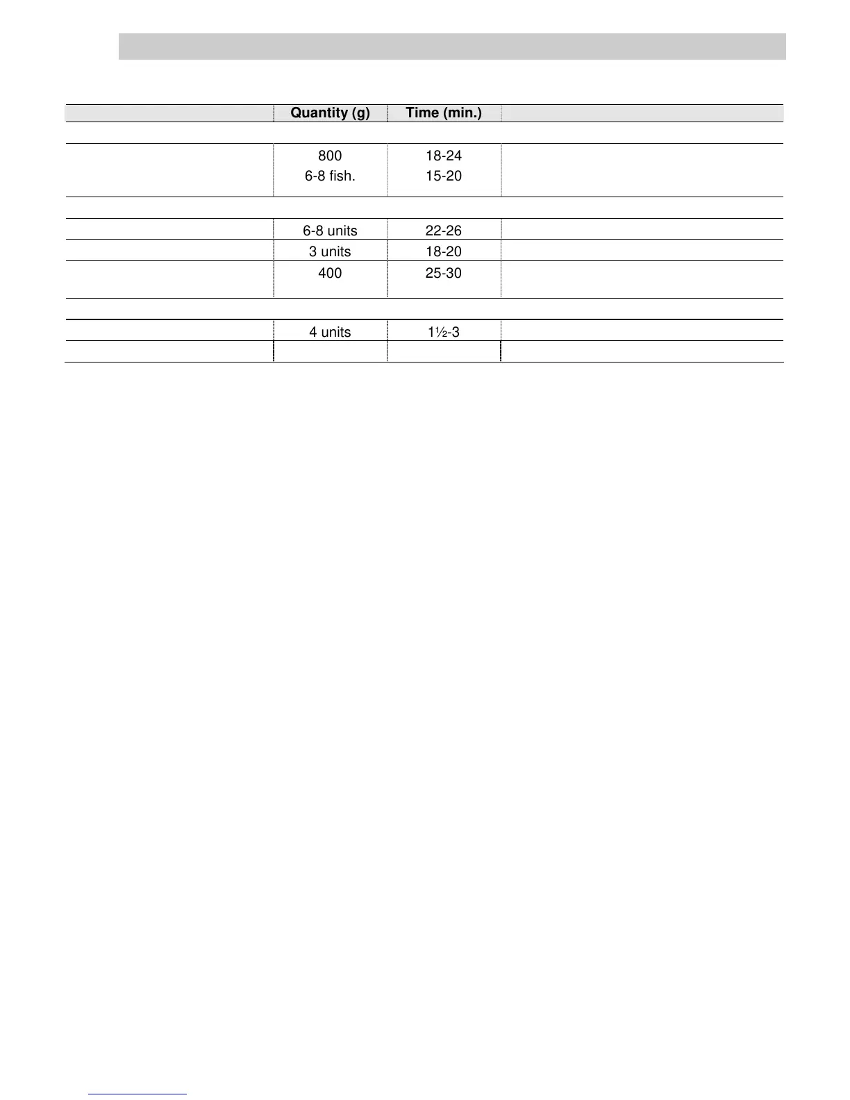 Fish Quantity (g) Time (min.) Instructions