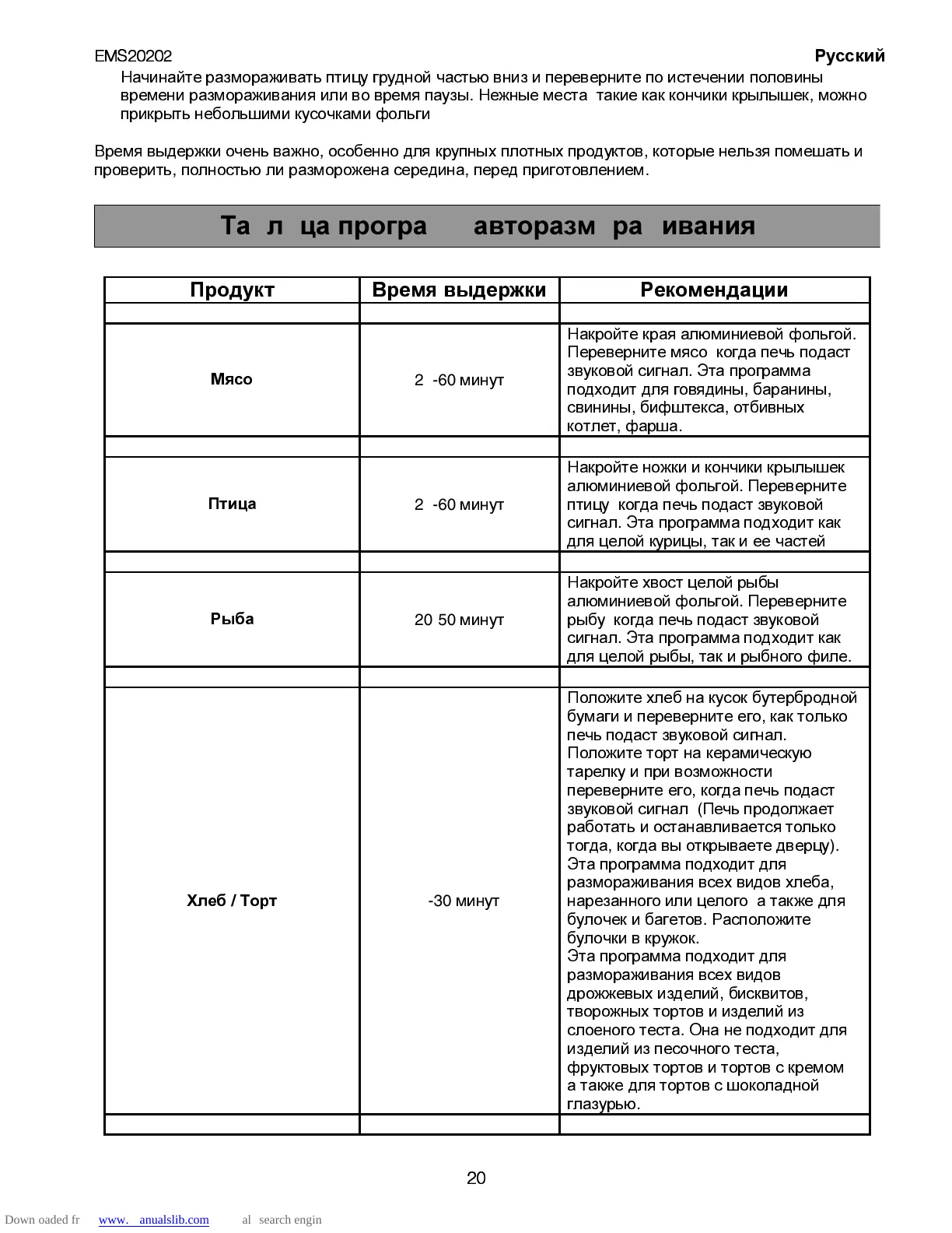 Таблица программ авторазмораживания