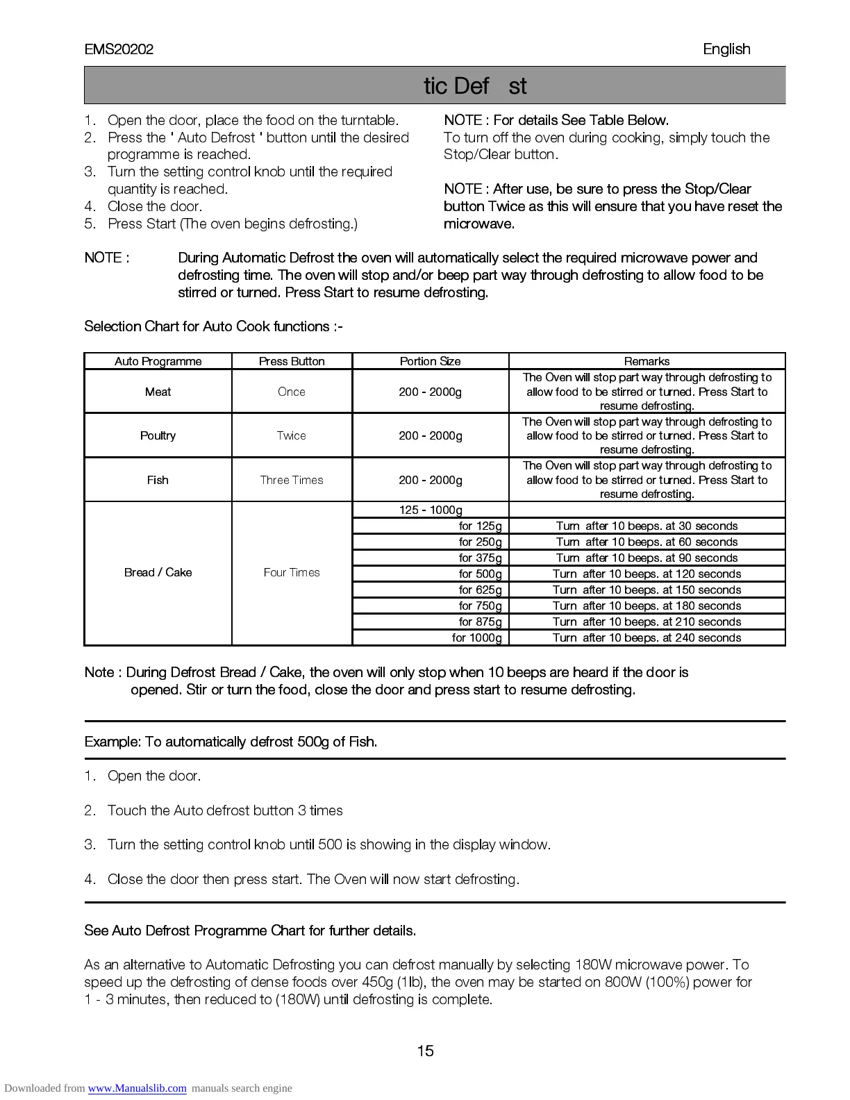 Example: To a utomatically defrost 500g of Fish.