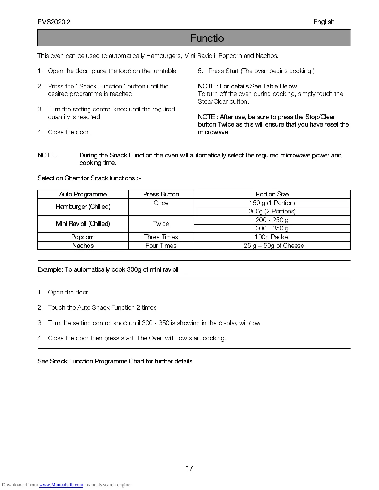NOT E : During the Sn ack Fun ction the oven will auto matically select th e required microwave power and