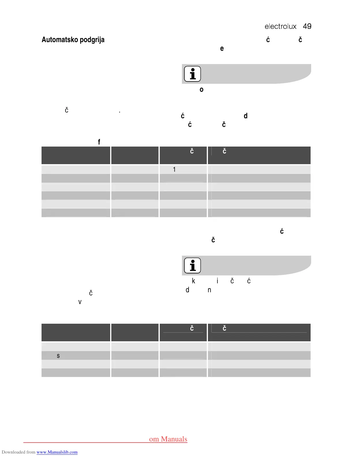 Tablica odabira za funkcije automatskog podgrijavanja: