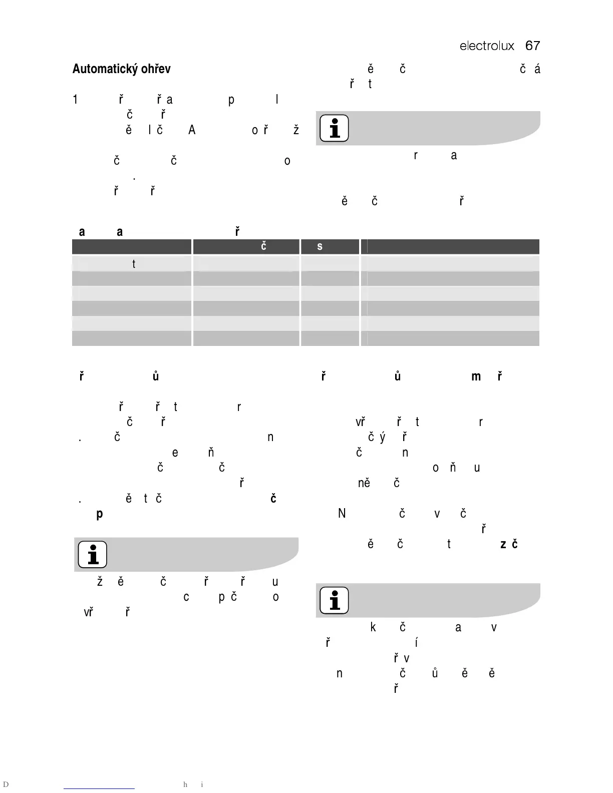 Tabulka automatické funkce oh