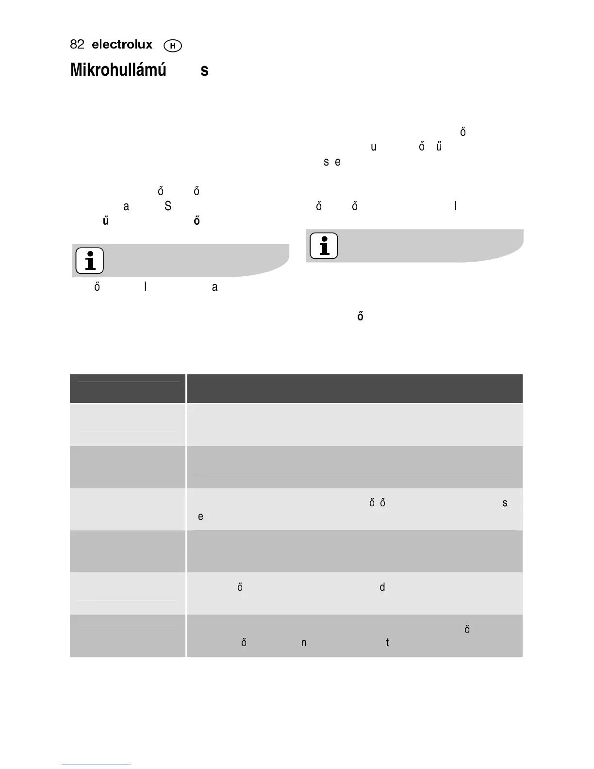 Mikrohullámú teljesítmény táblázat