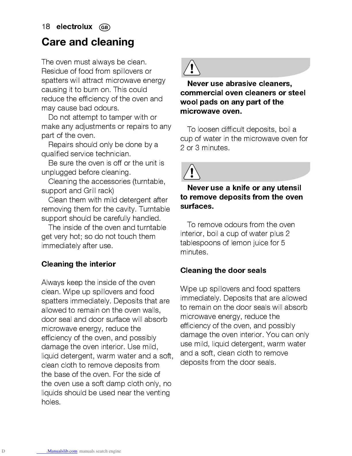 Electrolux EMS2320X - Care and Cleaning; Cleaning the Interior; Cleaning the Door Seals
