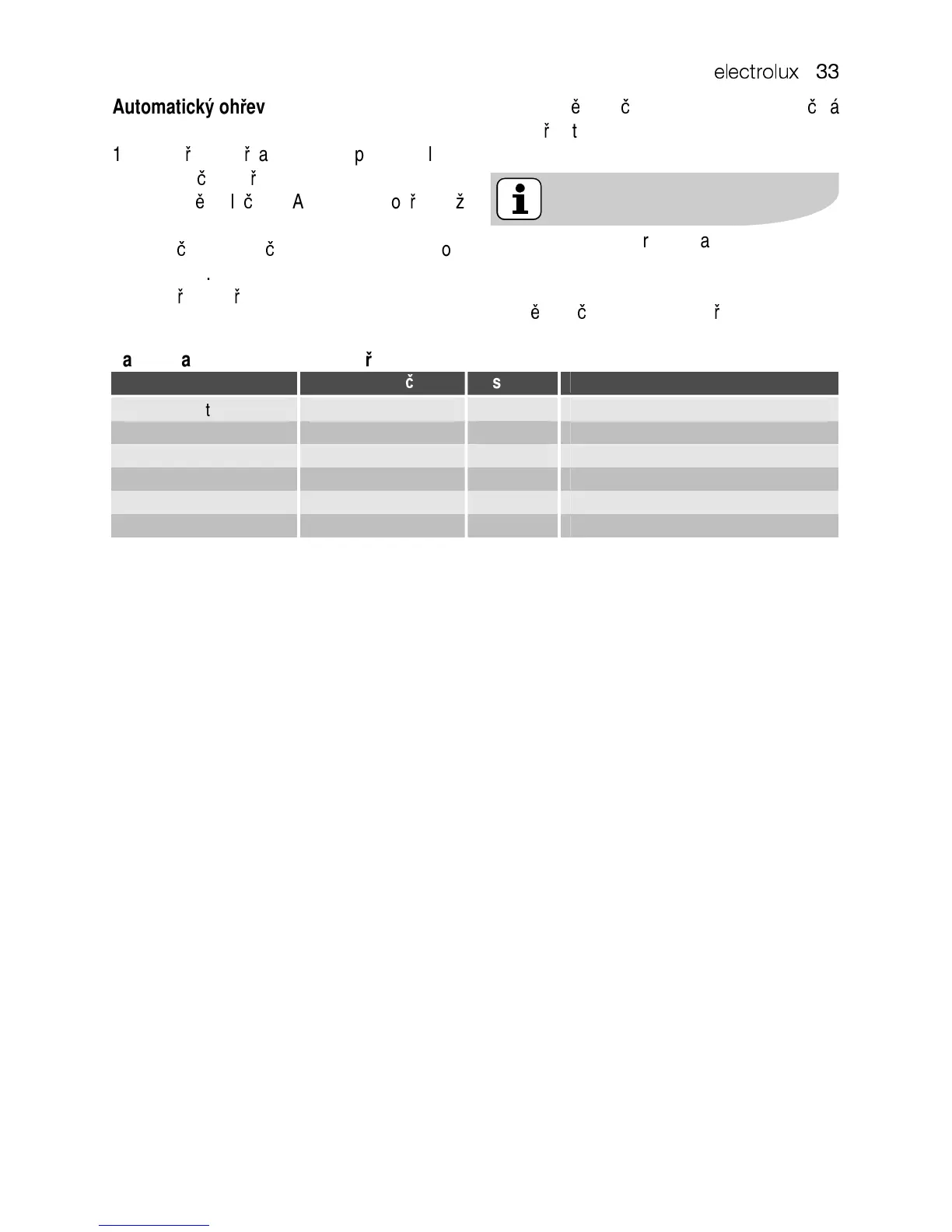 Tabulka automatické funkce oh