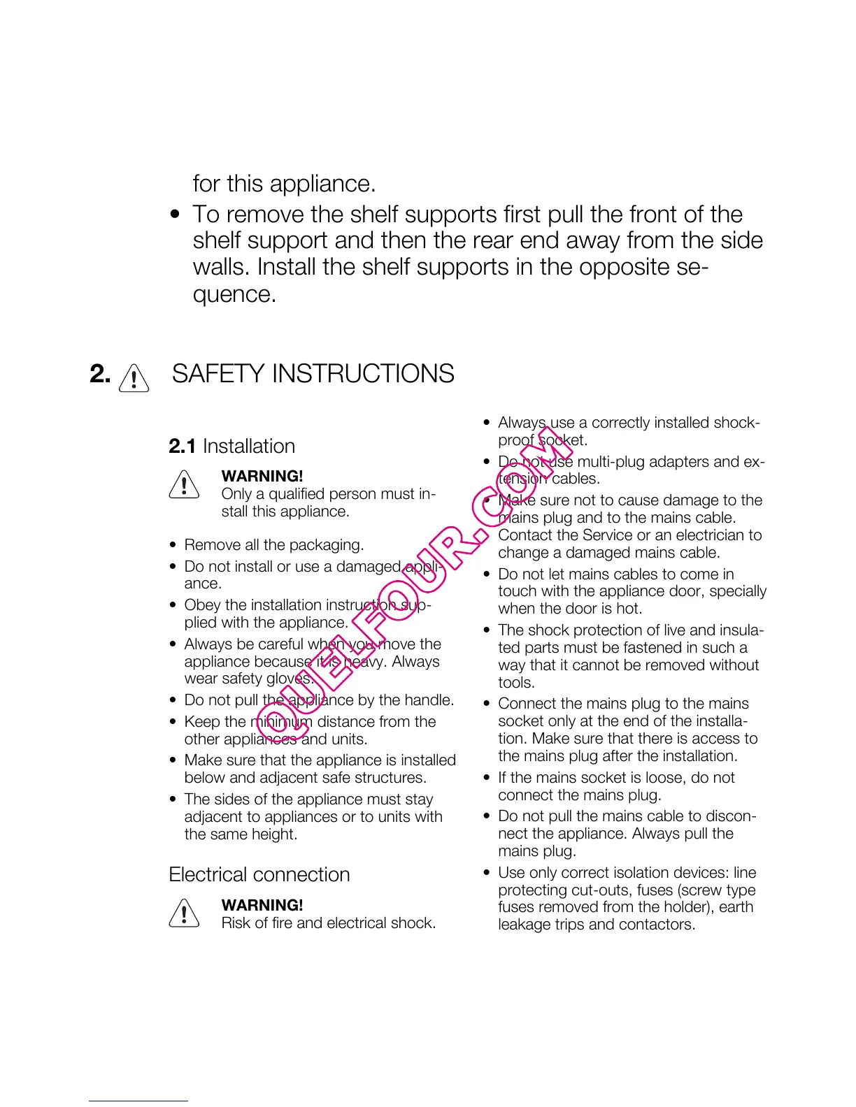 • To remove the shelf supports first pull the front of the
