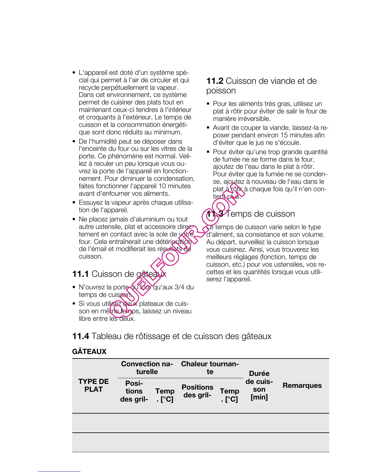 11.4 Tableau de rôtissage et de cuisson des gâteaux