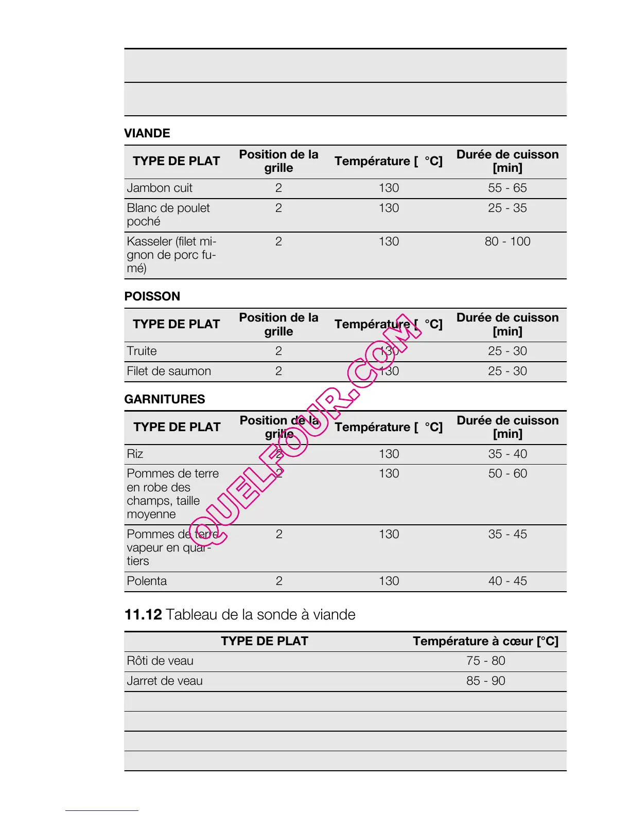 11.12 Tableau de la sonde à viande