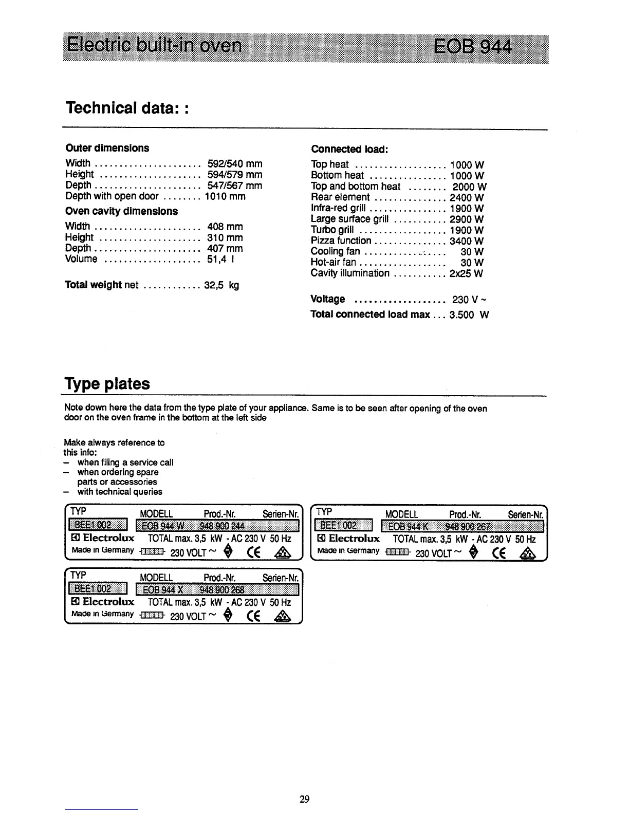 Electrolux EOB 944 - Technical Specifications and Data Plates; Appliance Dimensions and Weight; Connected Load Details; Understanding Type Plate Information