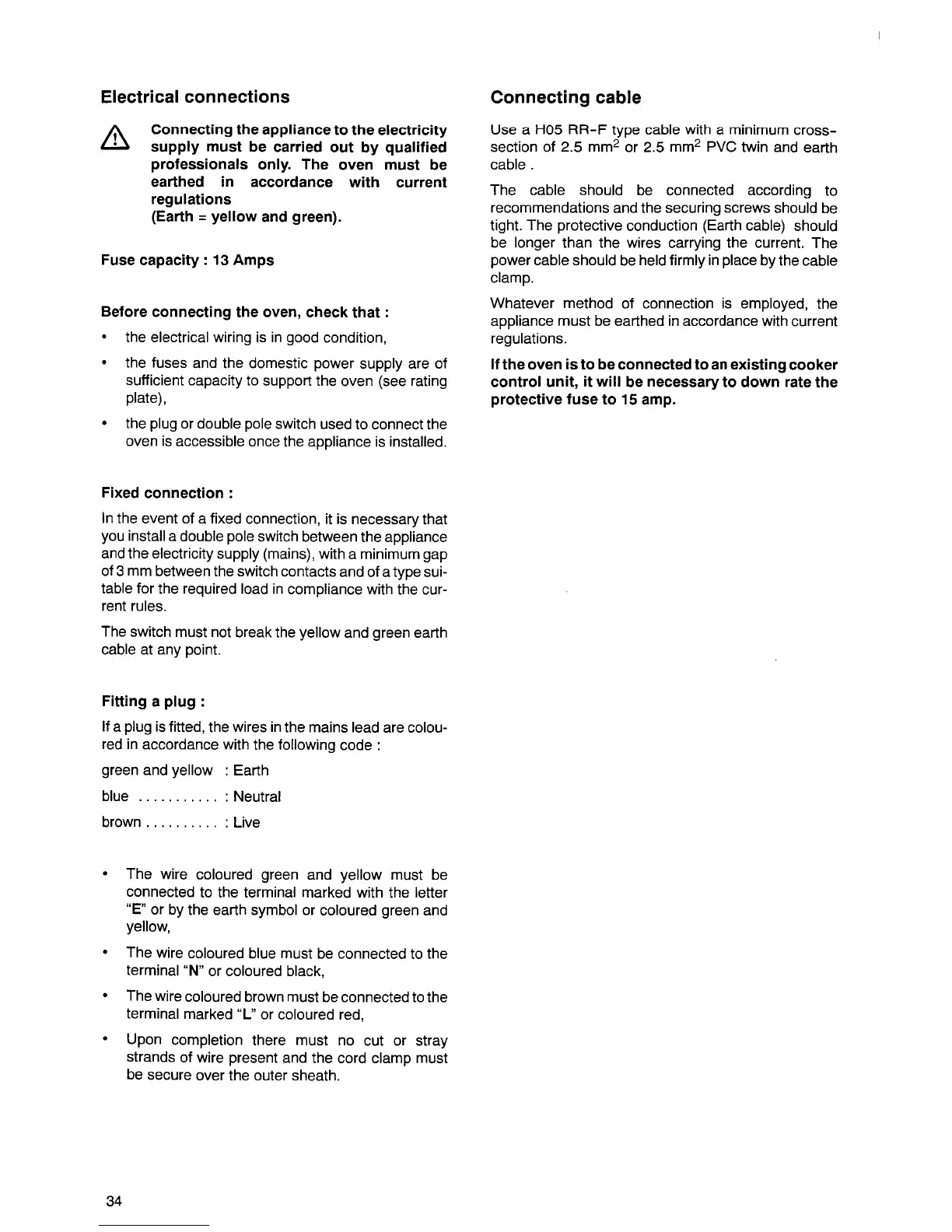 Electrolux EOB977 - Electrical Connections; Connecting Cable Specifications; Fixed Connection Procedure; Plug Fitting Instructions