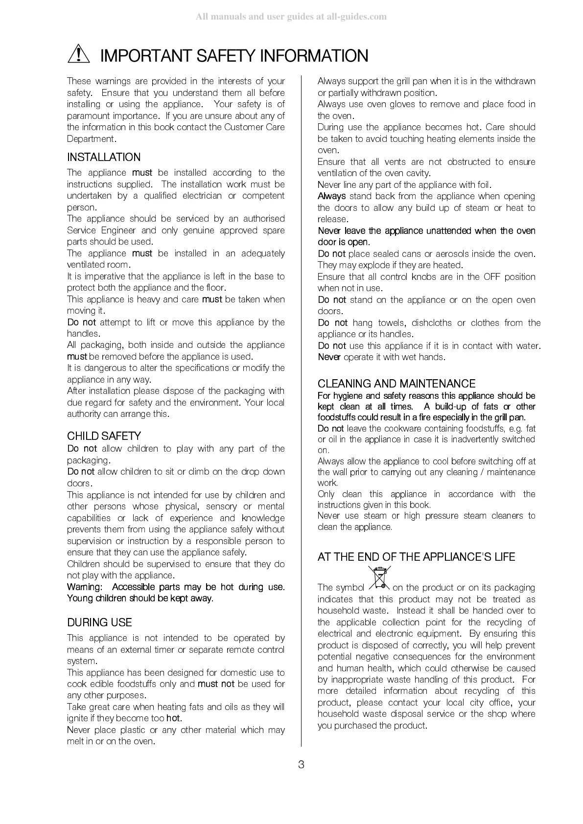 installing or using the appliance. Your safety is of