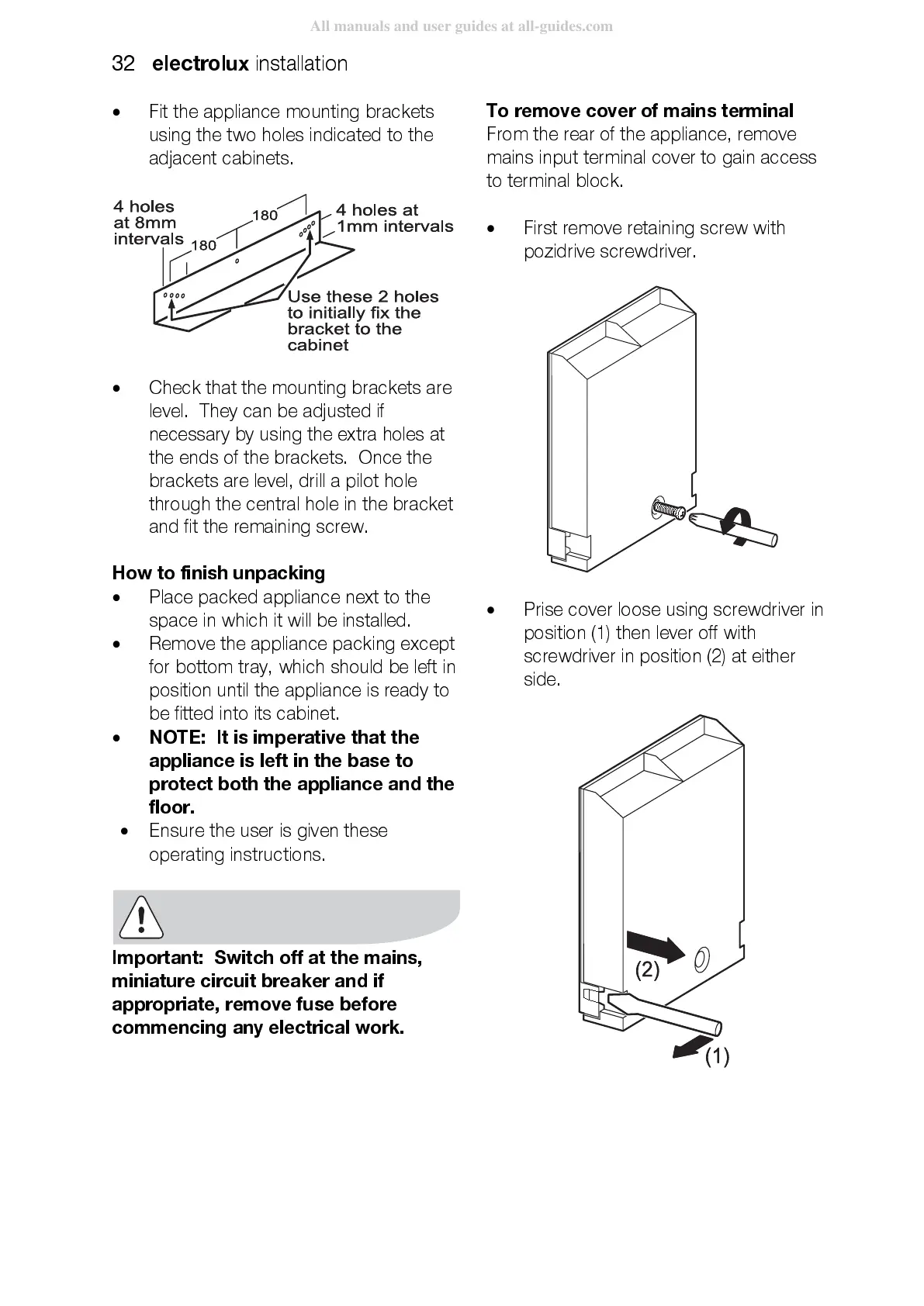 To remove cover of mains terminal