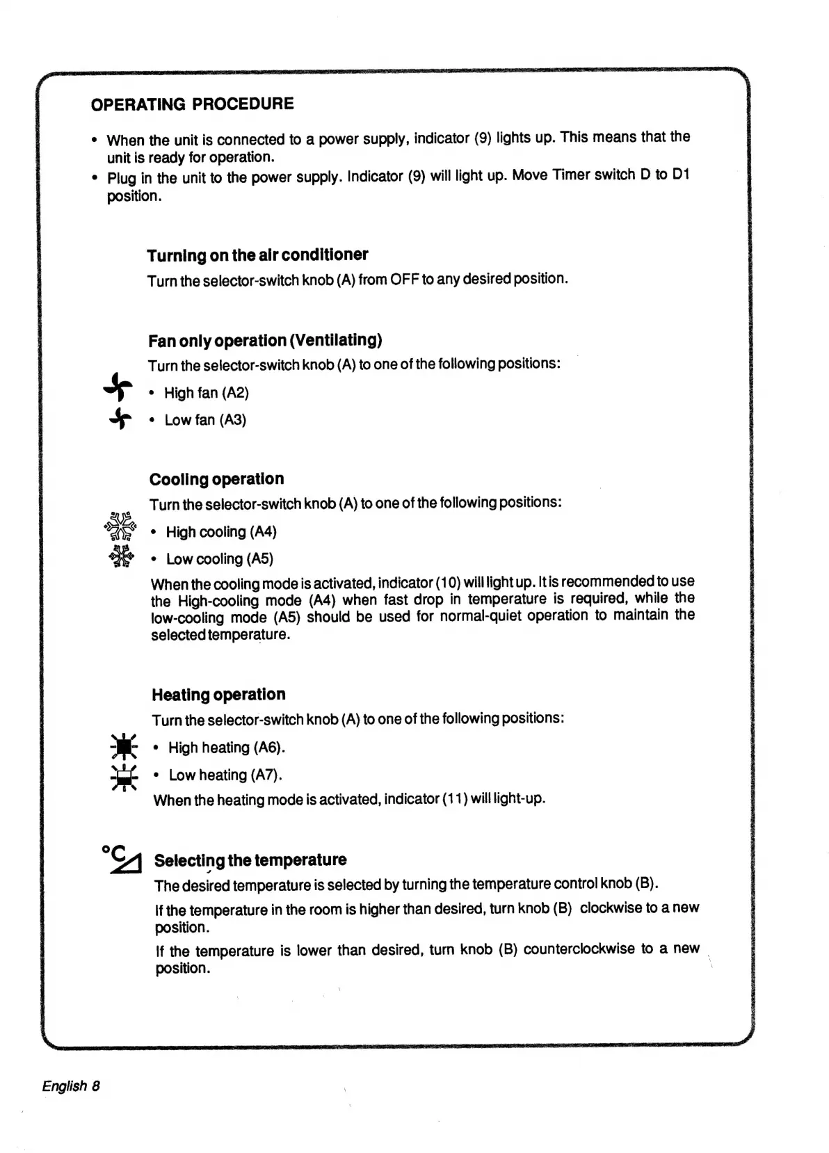 Electrolux EPT-800 - Starting the Air Conditioner; Fan Operation Mode; Cooling Operation Mode; Heating Operation Mode