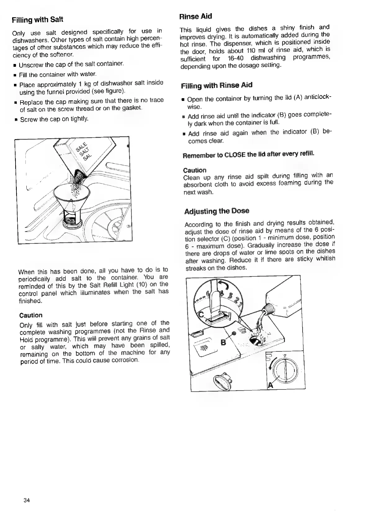 Electrolux ESF 472 - Filling with Salt; Rinse Aid; Filling with Rinse Aid; Adjusting the Dose