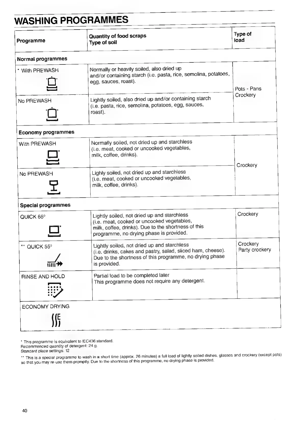 Electrolux ESF 472 - Washing Programmes; Normal programmes; Economy programmes; Special programmes