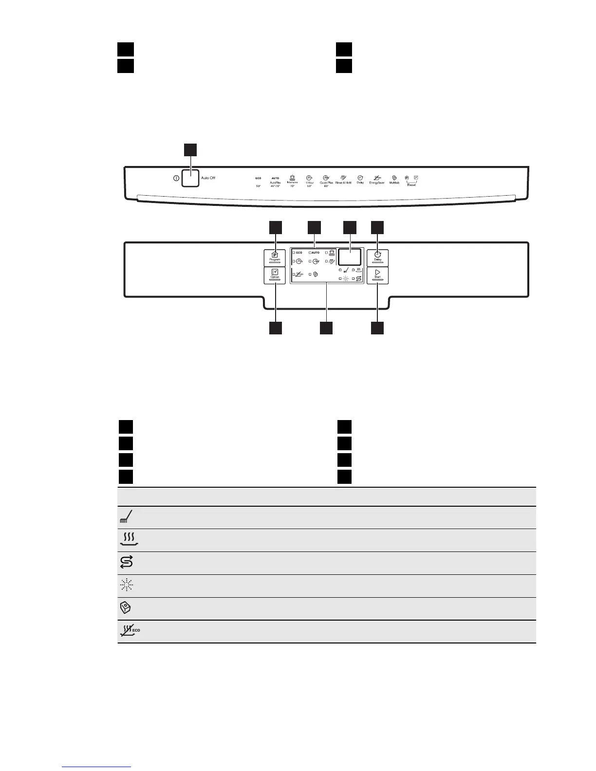 Kontrolka mycí fáze. Rozsvítí se, když probíhá mycí nebo oplachovací fáze.