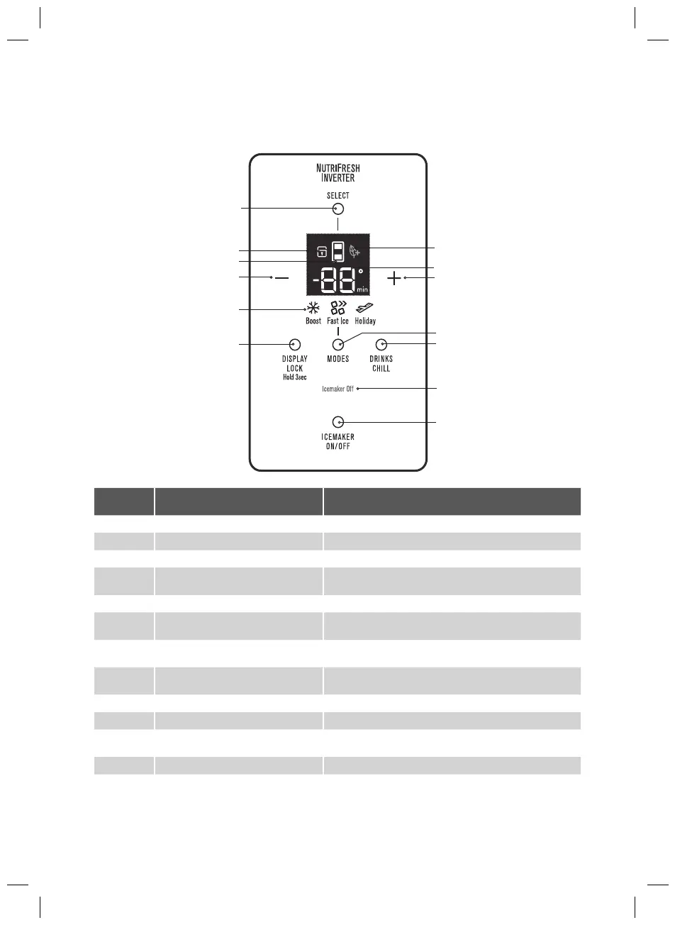12 Indikator status Pembuat es (Icemaker) Menunjukkan status operasional.