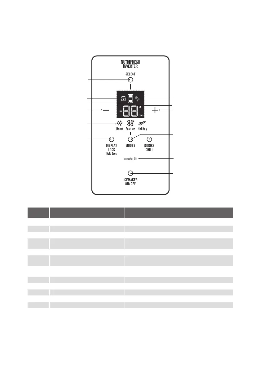8 Mode indicators (Boost, Fast Ice, Holiday) Indicates appliance operation mode.