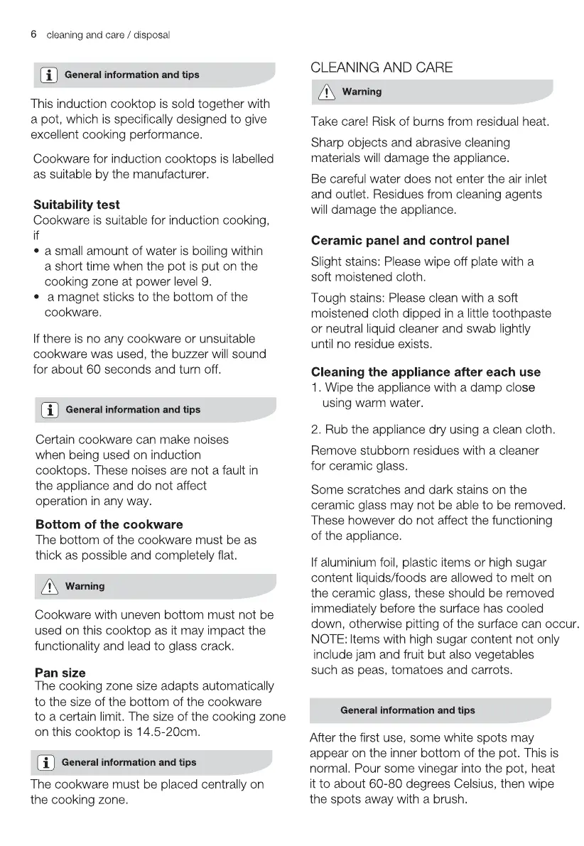 Electrolux ETD42SKA - Cleaning and Care; Cookware Bottom Requirements; Pan Size Guidelines; Cleaning Ceramic and Control Panels