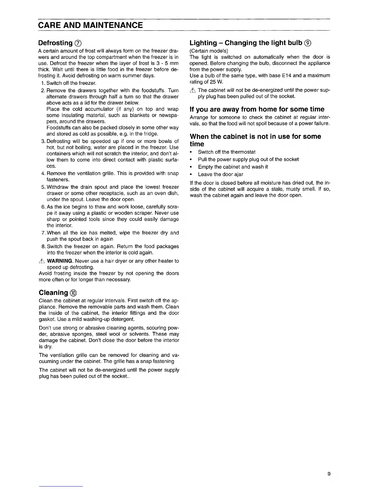 Electrolux EU 7117C - Care and Maintenance; Defrosting; Lighting; Changing the Light Bulb
