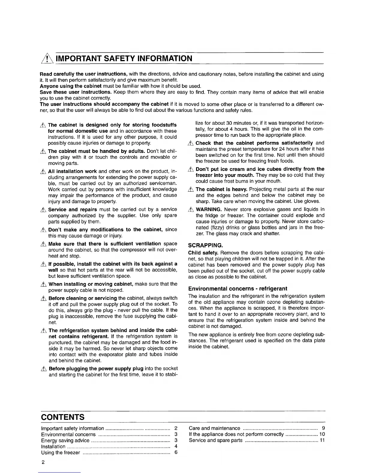 Electrolux EU 8216C - Important Safety Information; Contents; Scrapping