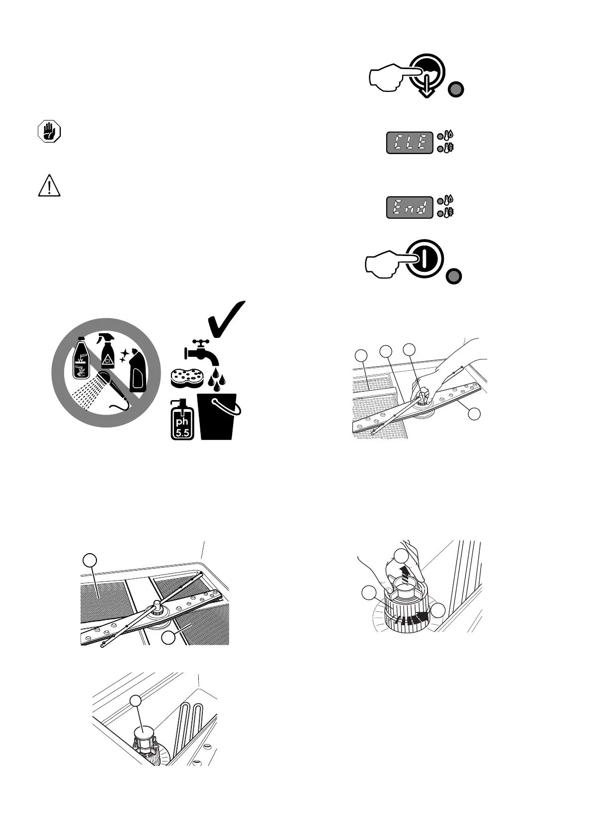 • Remove the top and bottom wash and rinse arms “F“ and “I“,