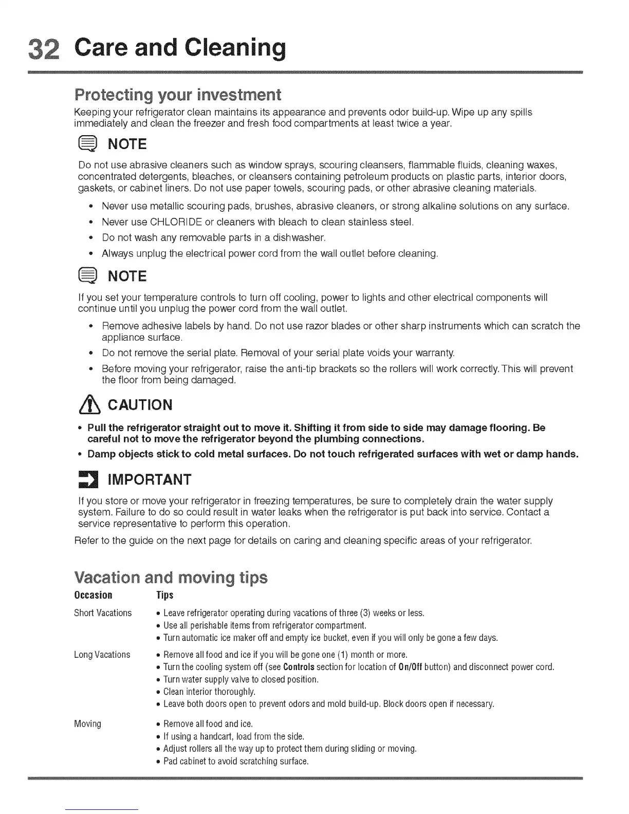 Refer to the guide on the next page for details on caring and cleaning specific areas of your refrigerator.