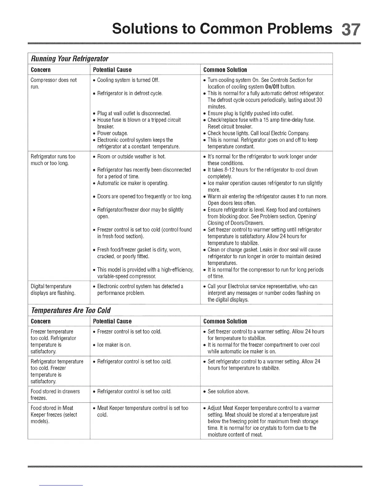 Refrigerator temperature ,, Refrigeratorcontrol isset too cold. ,, Set refrigerator control to a warmer setting.Allow 24