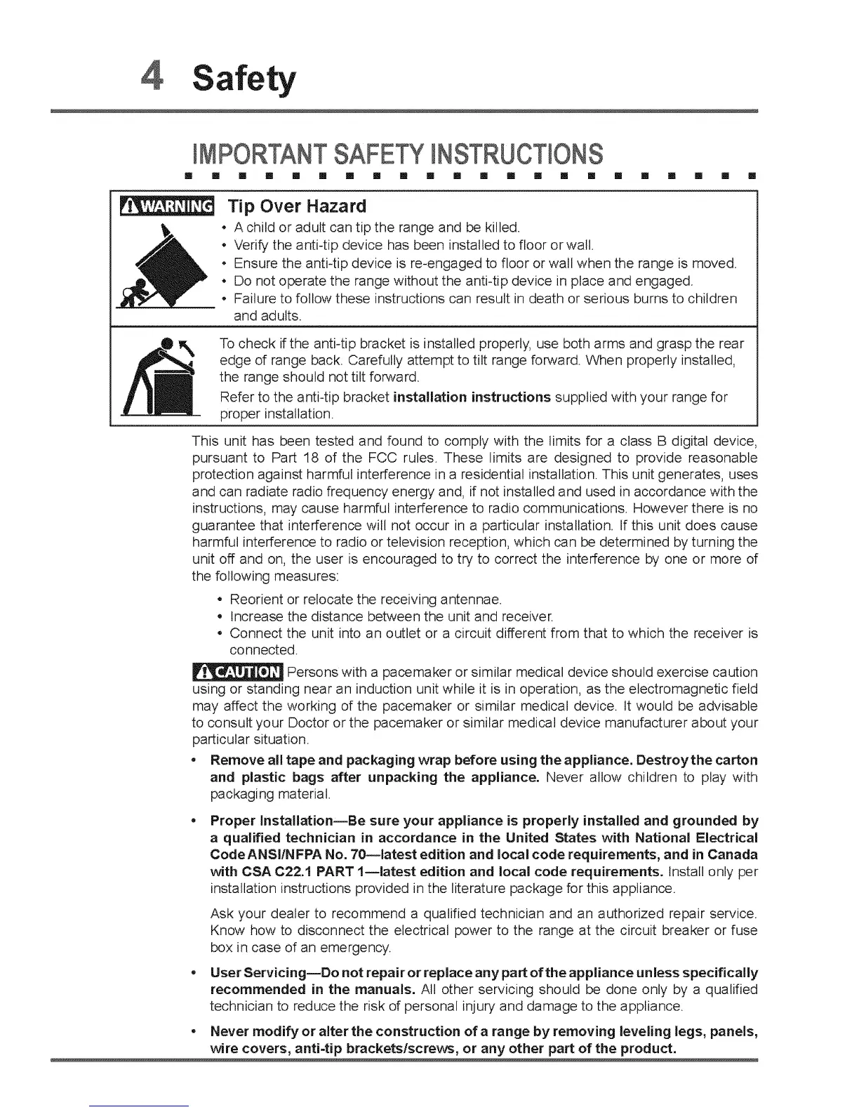 • Never modify or alter the construction of a range by removing leveling legs, panels,