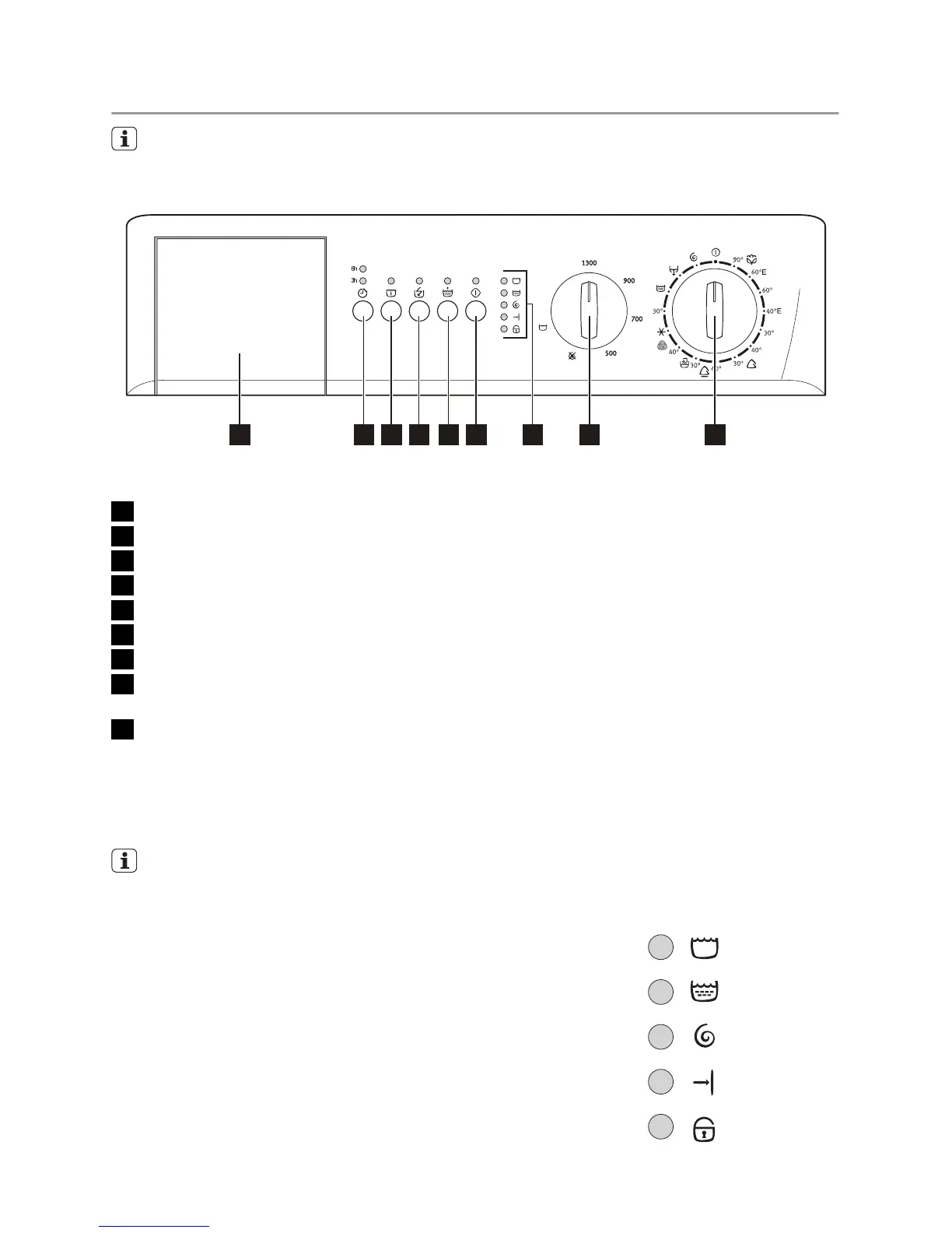 El selector de programas, el selector de centrifugado, las luces de evolución del pro-
