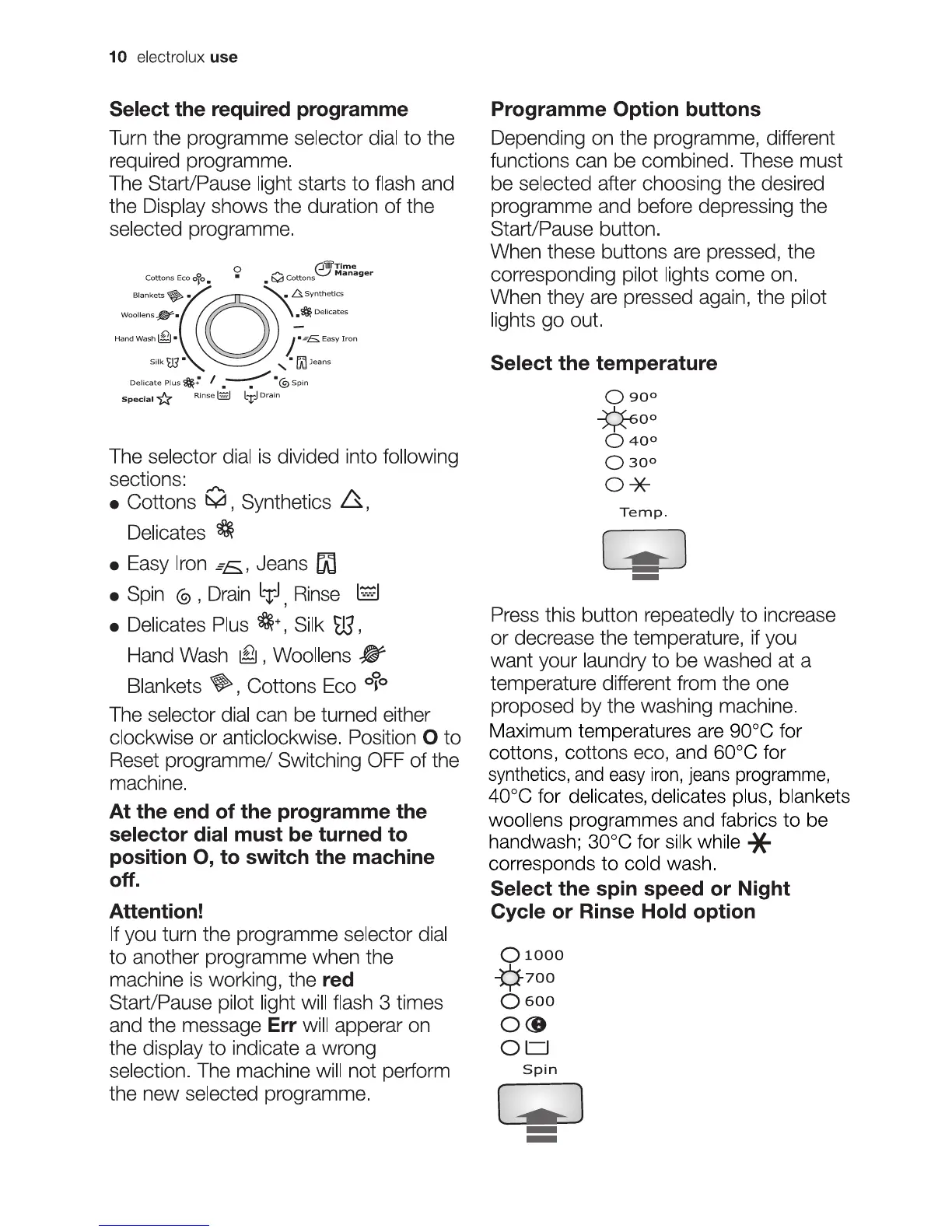Electrolux EWF 1073 - Programme and Option Selection; Programme and Temperature Selection; Spin, Night Cycle, and Rinse Hold