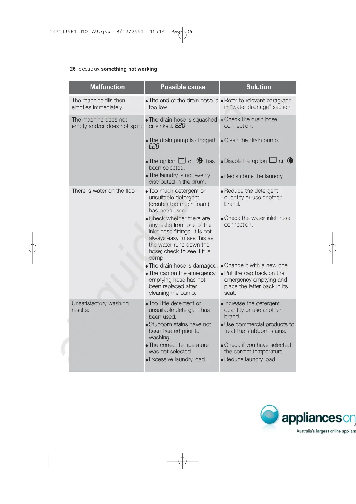 Malfunction Possible cause Solution