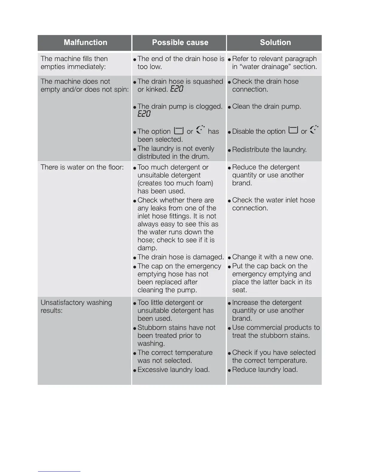 Electrolux EWF 12821 - Troubleshooting: Drainage, Spin, and Washing Results; Drainage, Spin, and Leakage Issues; Unsatisfactory Washing Results