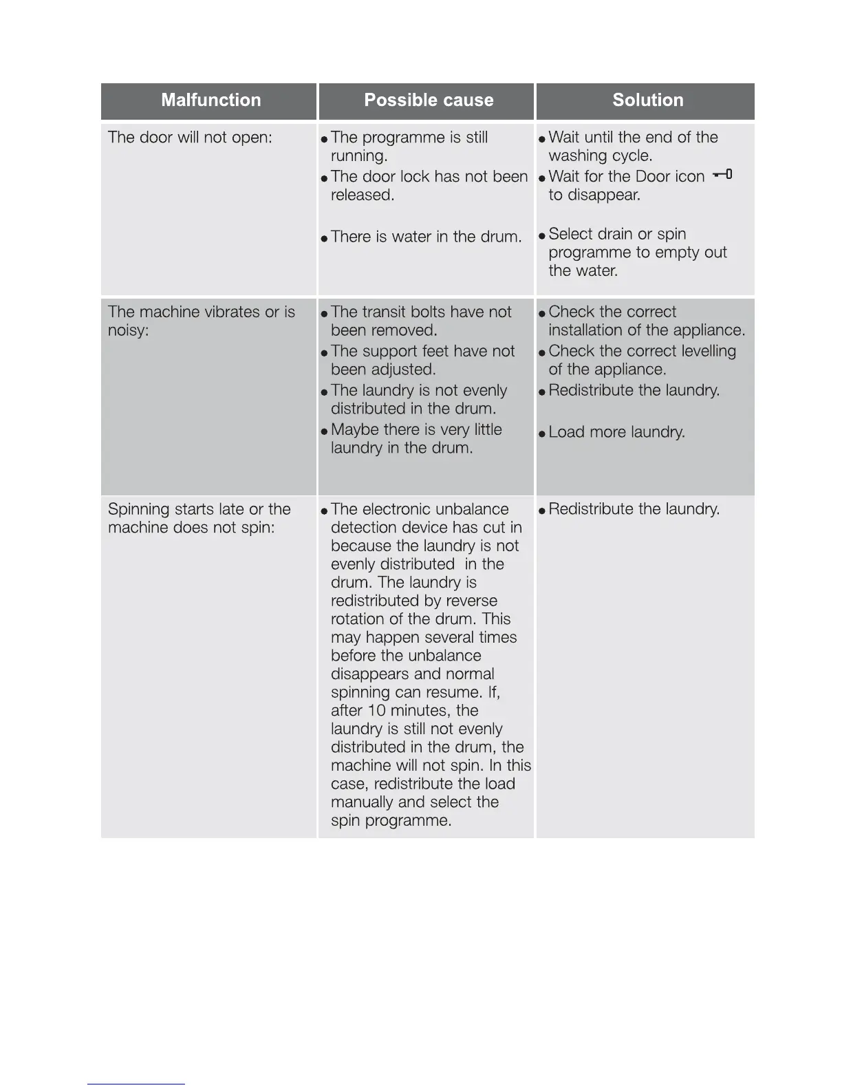 Electrolux EWF 12821 - Troubleshooting: Door, Noise, and Spin Issues; Door Opening and Noise Issues; Spinning Performance Problems