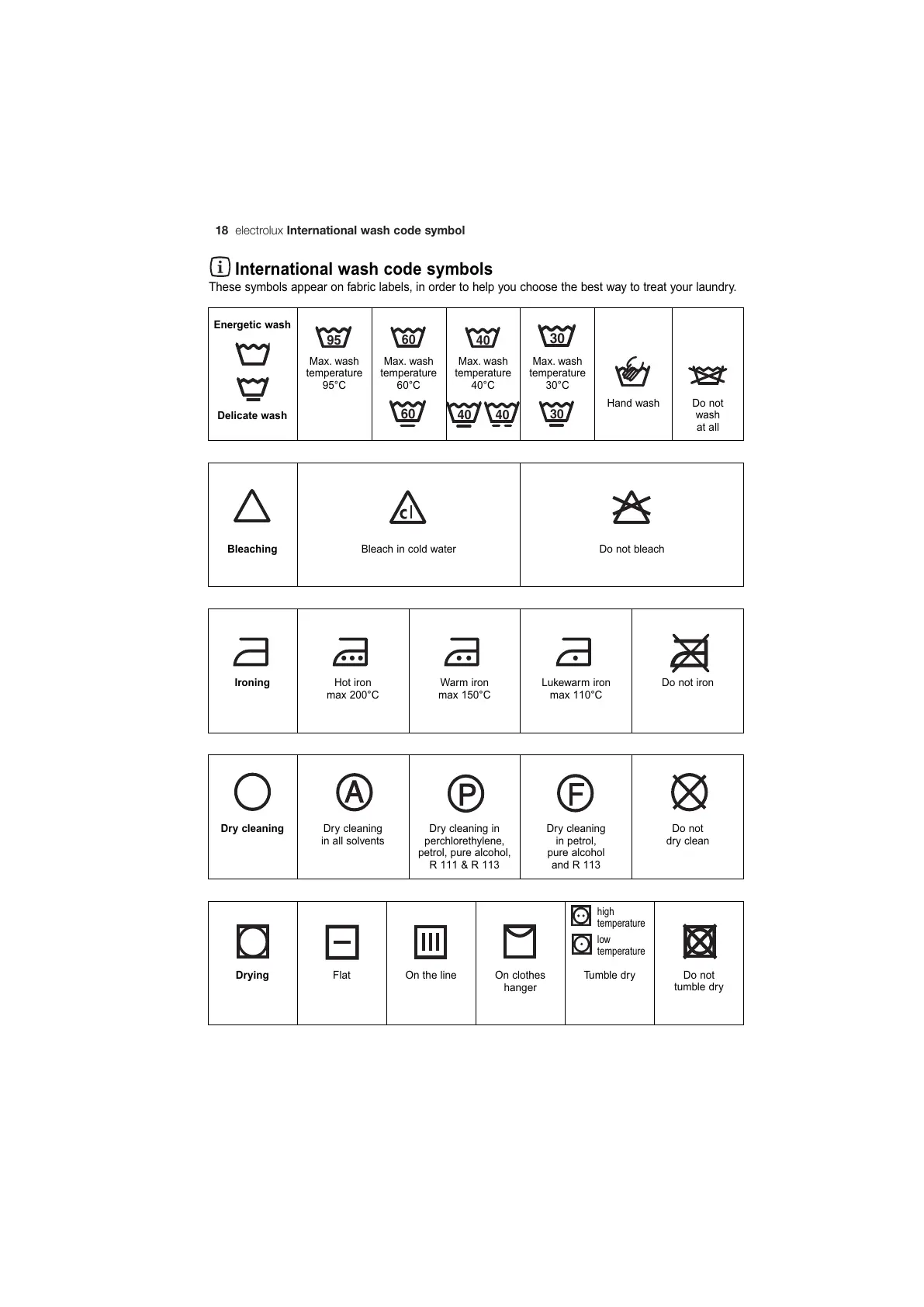 These symbols appear on fabric labels, in order to help you choose the best way to treat your laundry.