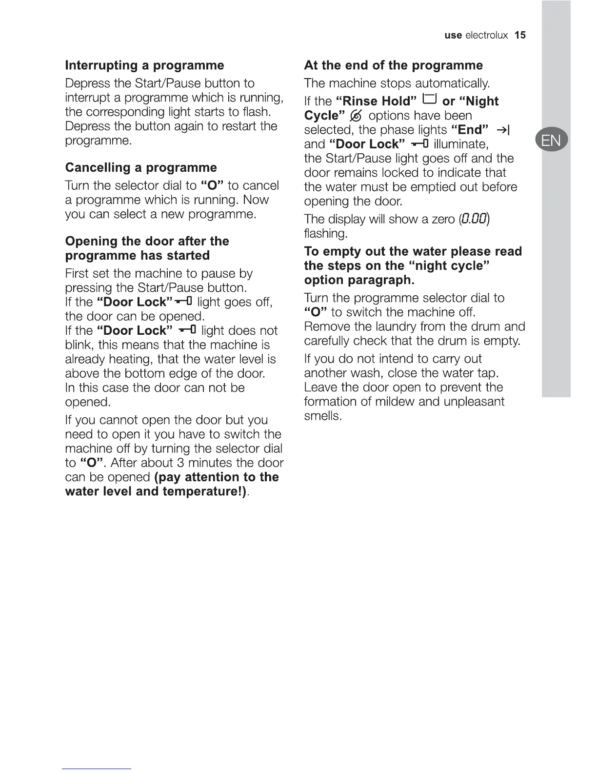 Electrolux EWF10841 - Programme Interruption and Cancellation; Opening the Door Safely; End of Programme Procedures; Emptying Water After Special Options