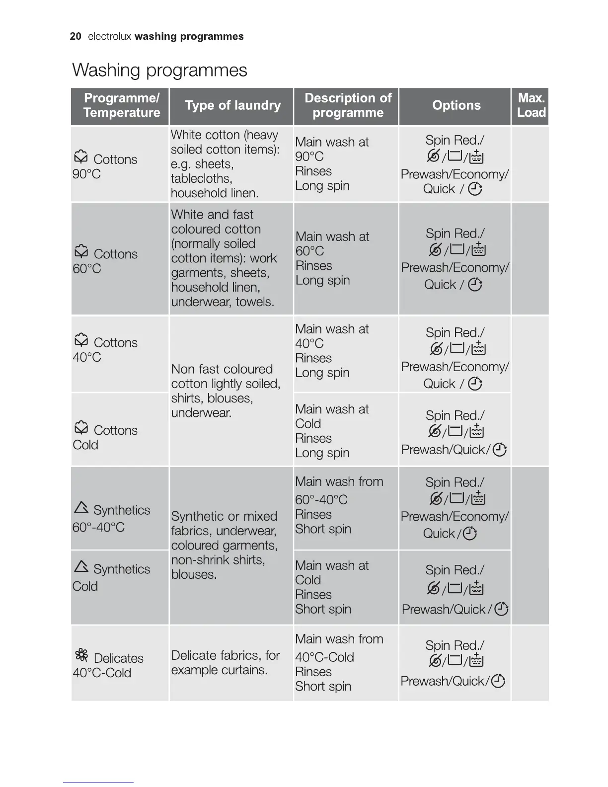 Electrolux EWF10841 - Washing Programmes Overview; Cotton Programmes; Synthetics and Delicates Programmes