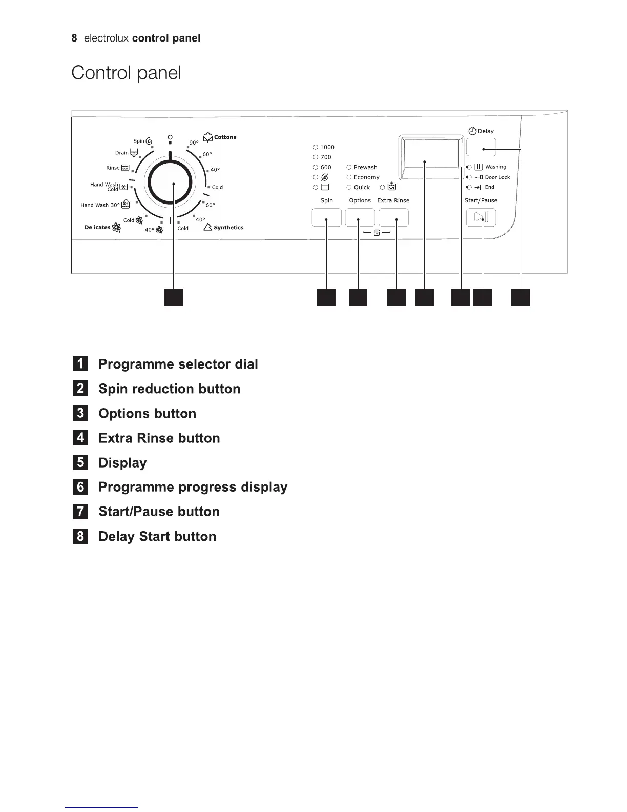 Electrolux EWF10841 - Control Panel; Programme Selection and Timing; Wash Options and Operation Buttons
